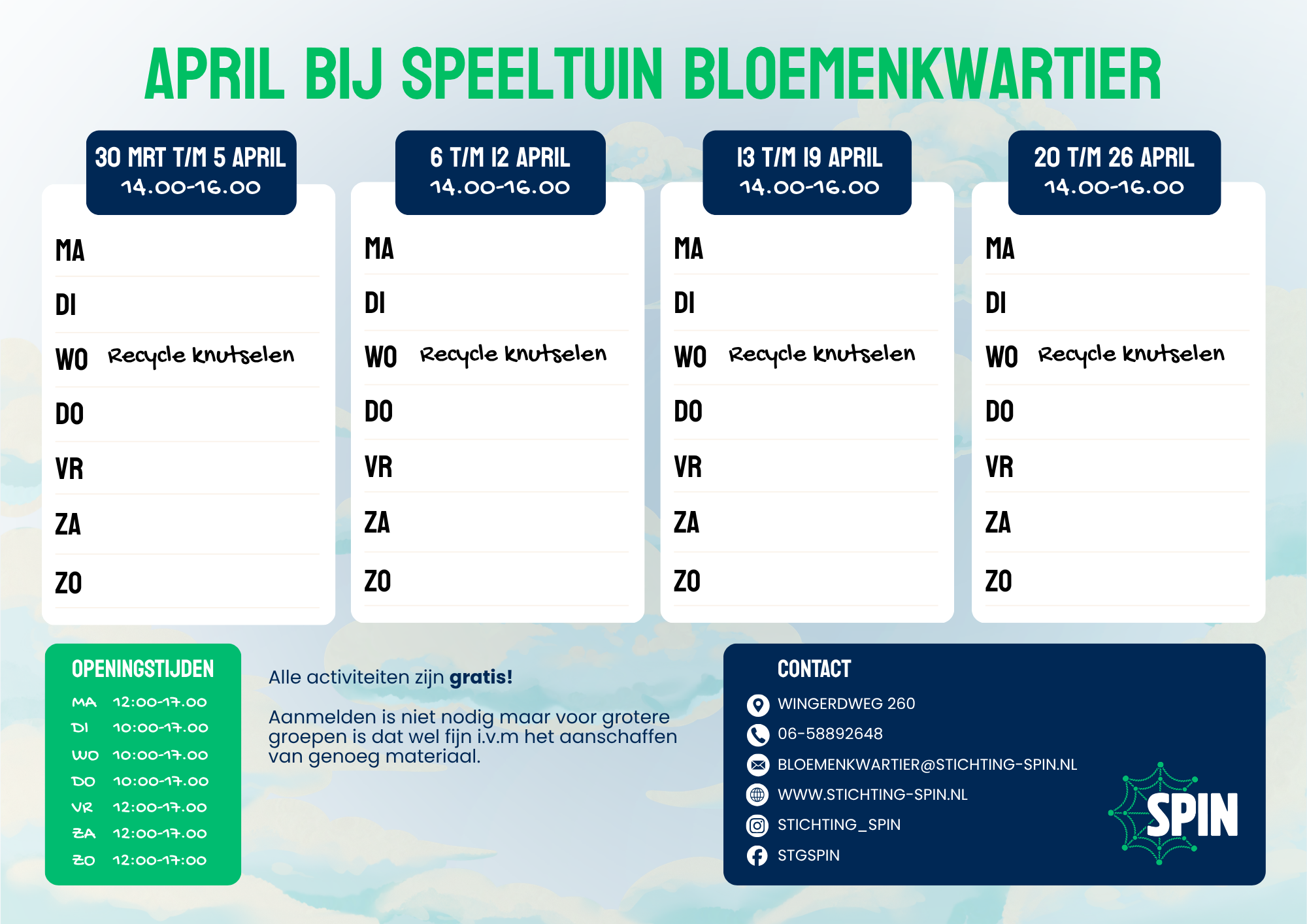 De speeltuin is open, met toezicht en spelbegeleiding, op de volgende tijden: