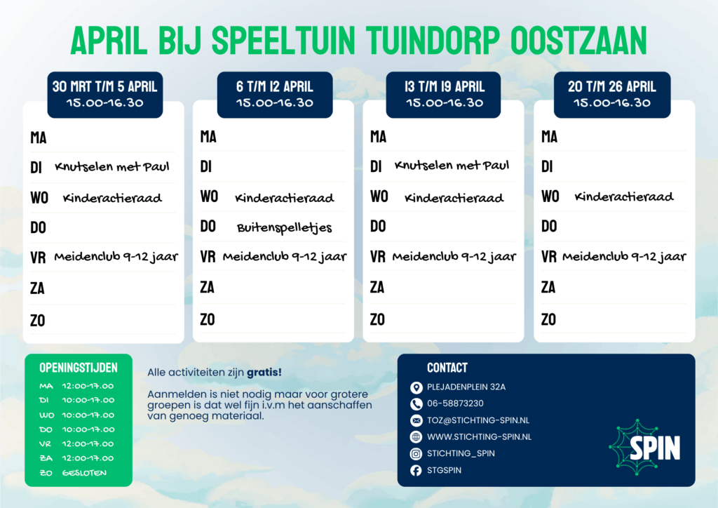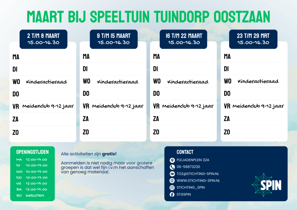 De speeltuin is open, met toezicht en spelbegeleiding, op de volgende tijden: